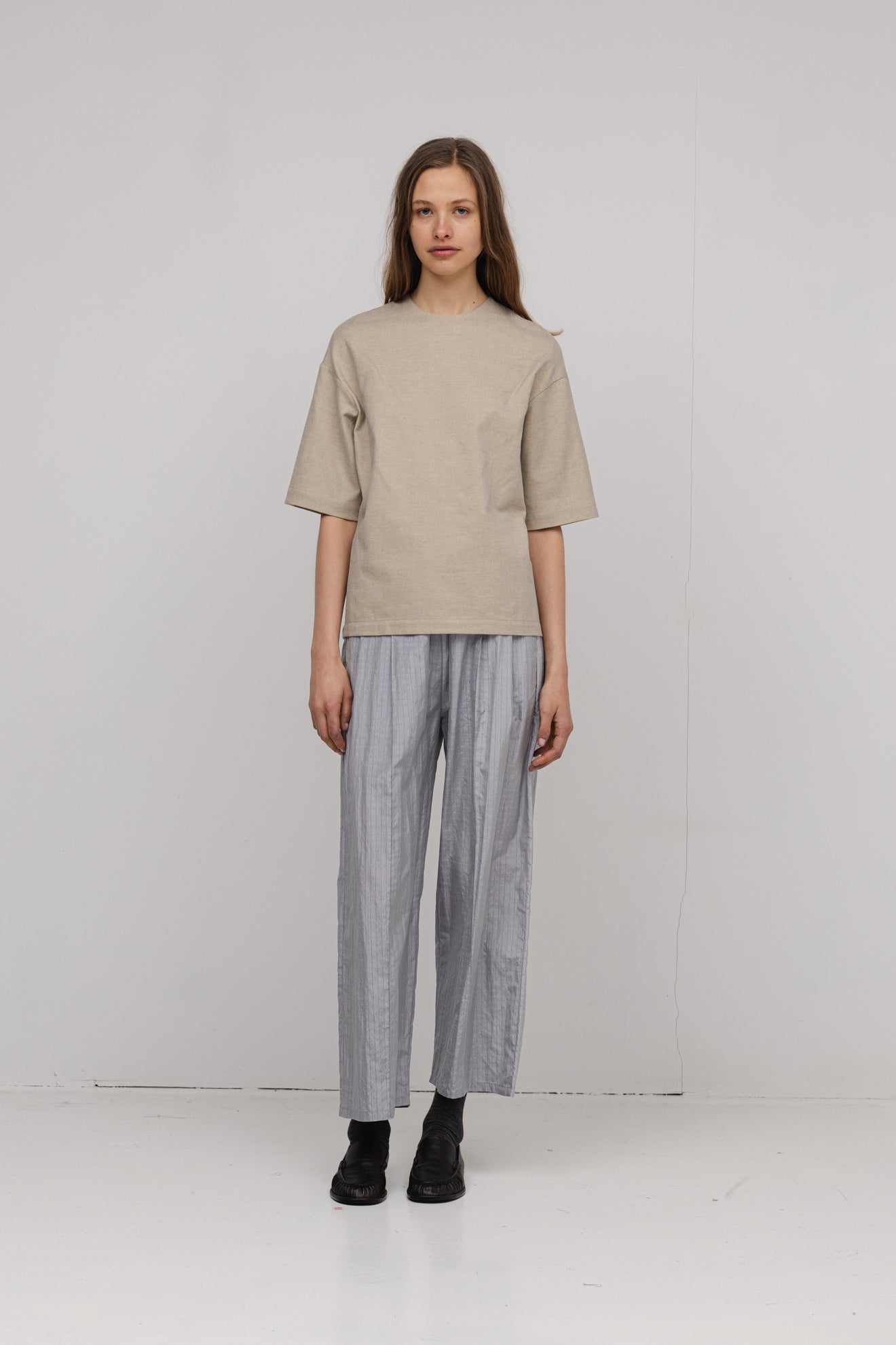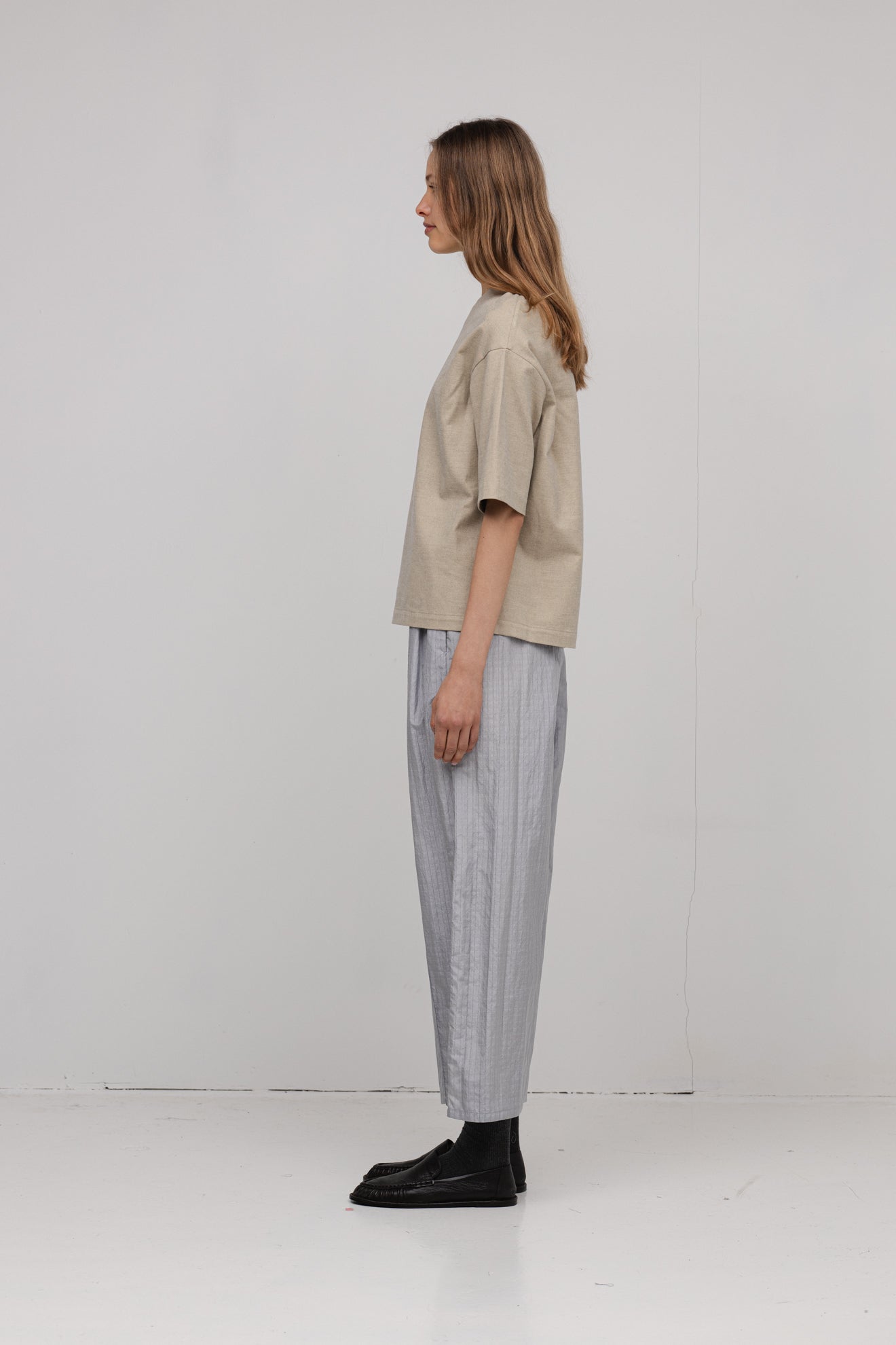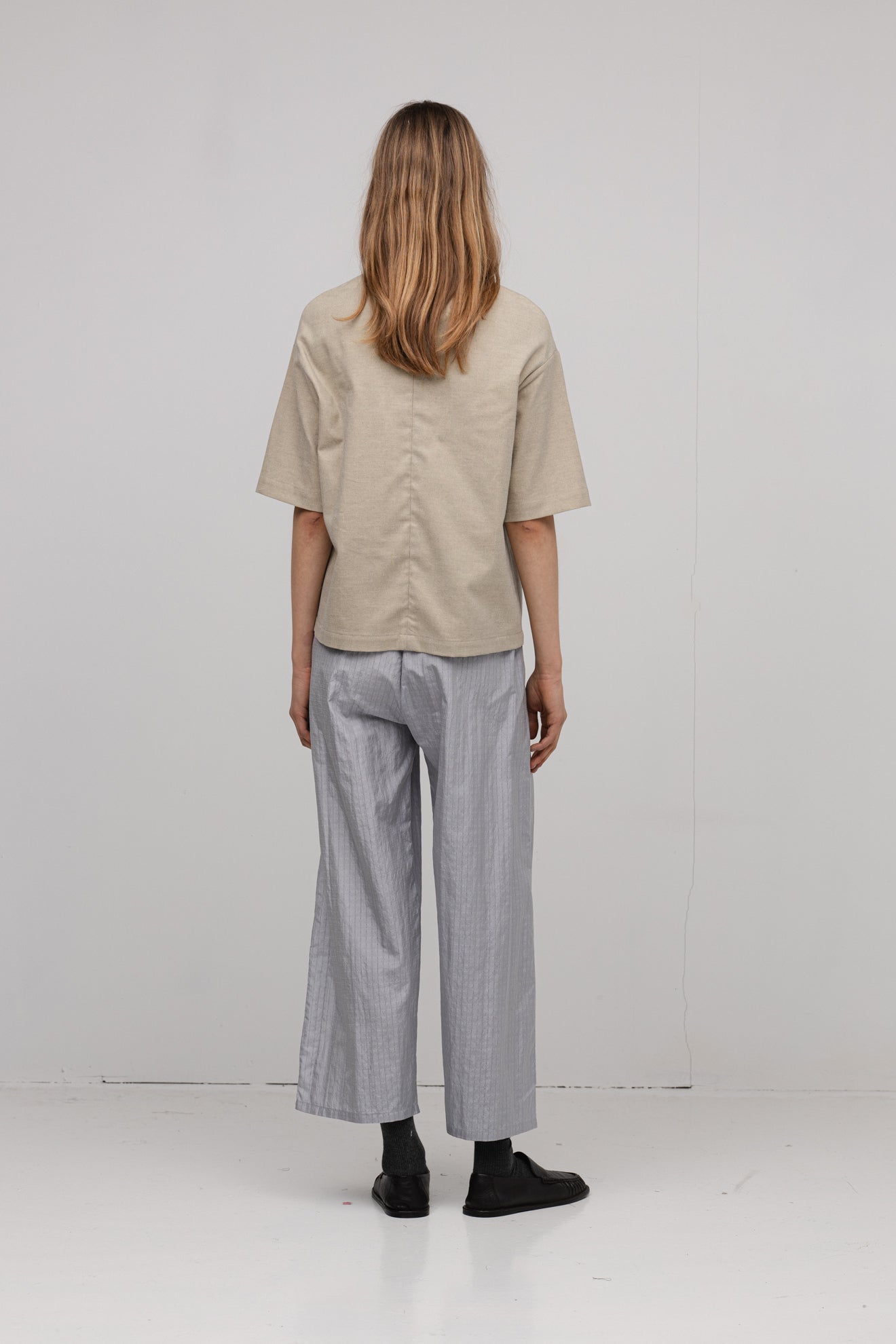 A cropped t-shirt crafted from a soft cotton-cashmere blend with a subtle fishbone texture. Designed with a clean silhouette and a button closure at the center back - a simple yet chic piece.