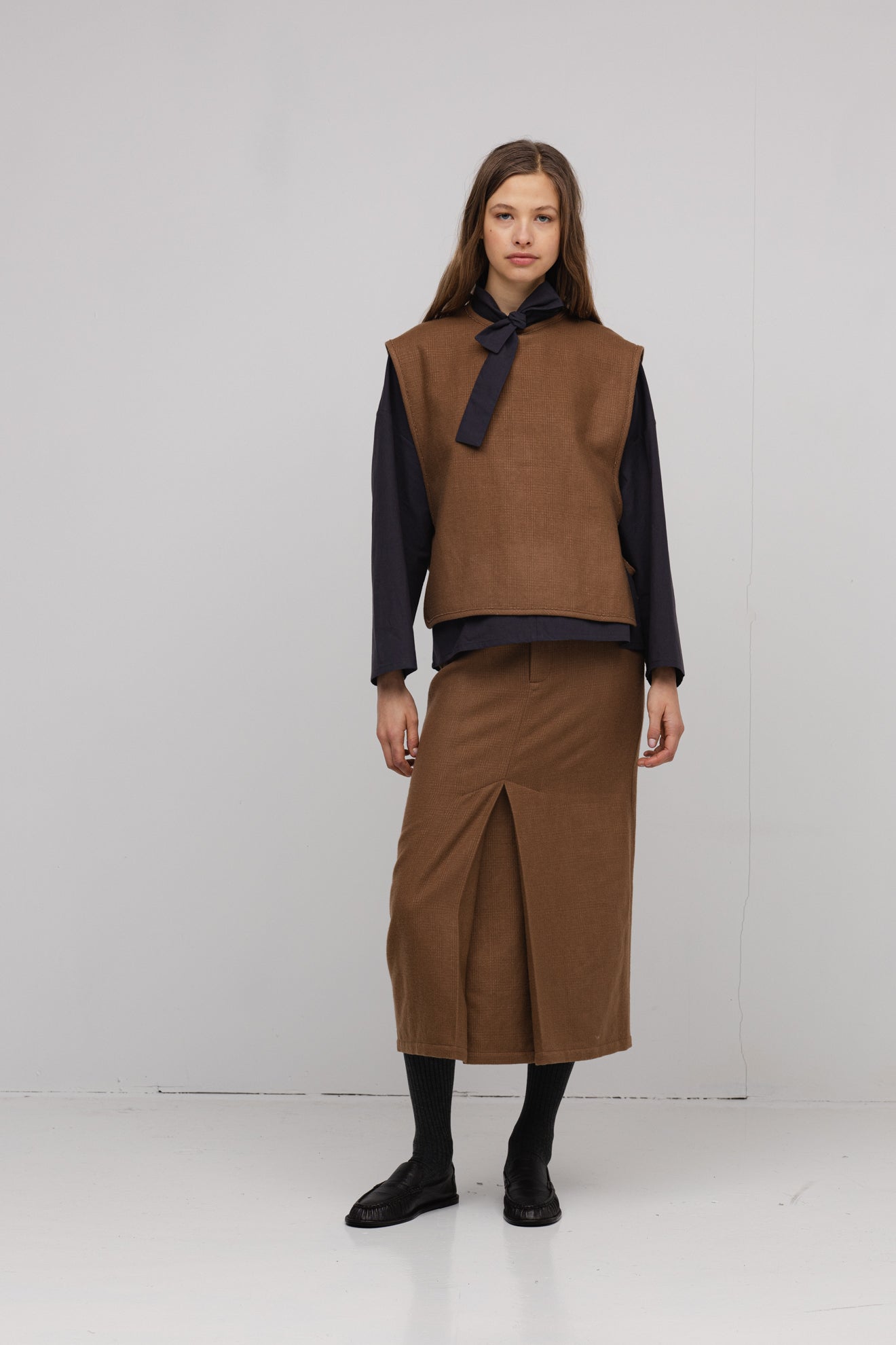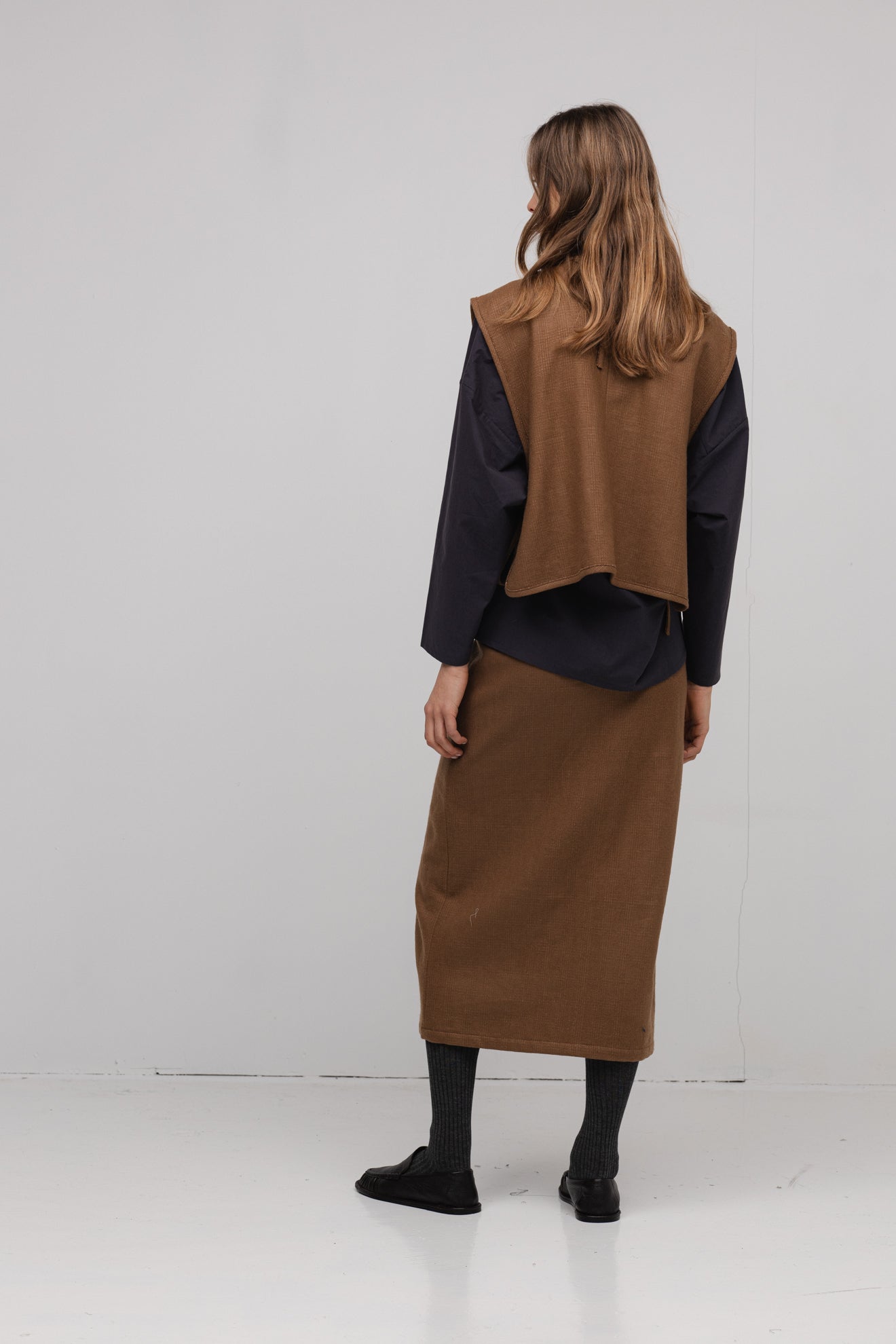 A simple skirt cut from a refined wool-linen blend. Designed with a clean box pleat at the front, raw edge details at the waistband, and a zip closure for a modern touch. Features a welt pocket and an elasticated back waistband for added comfort and ease.