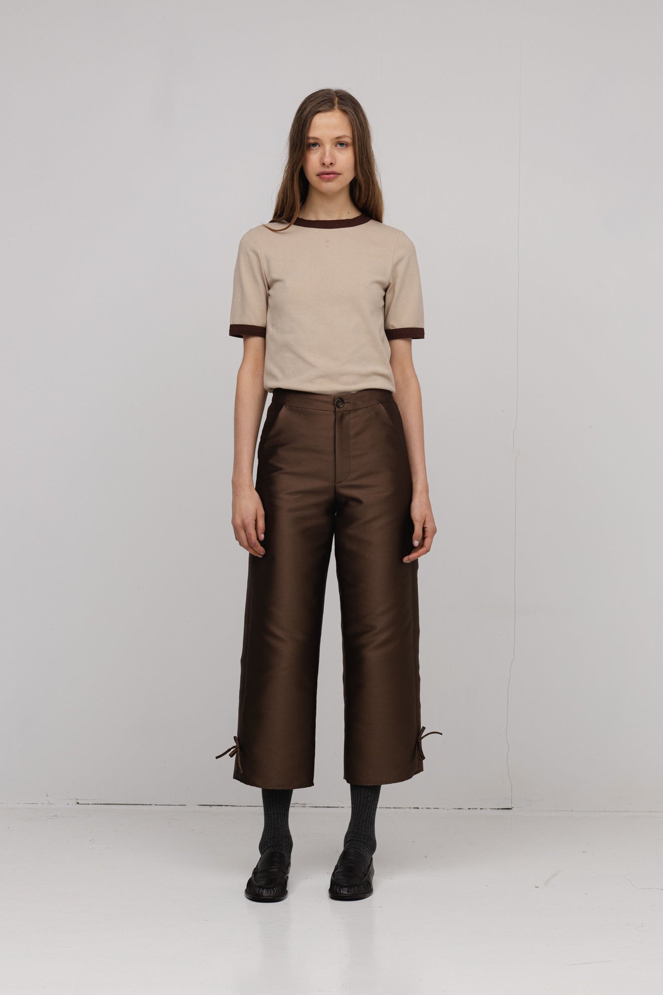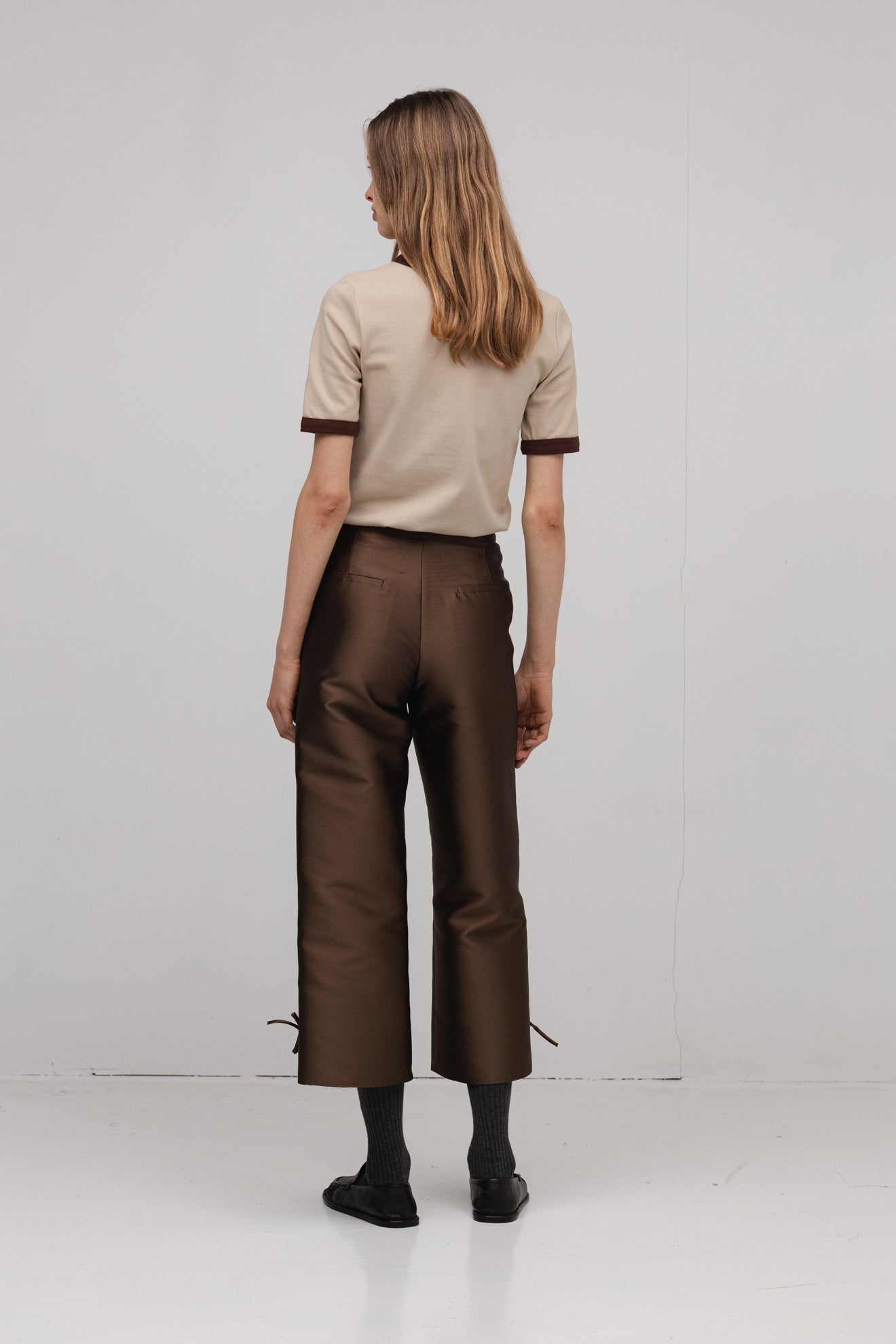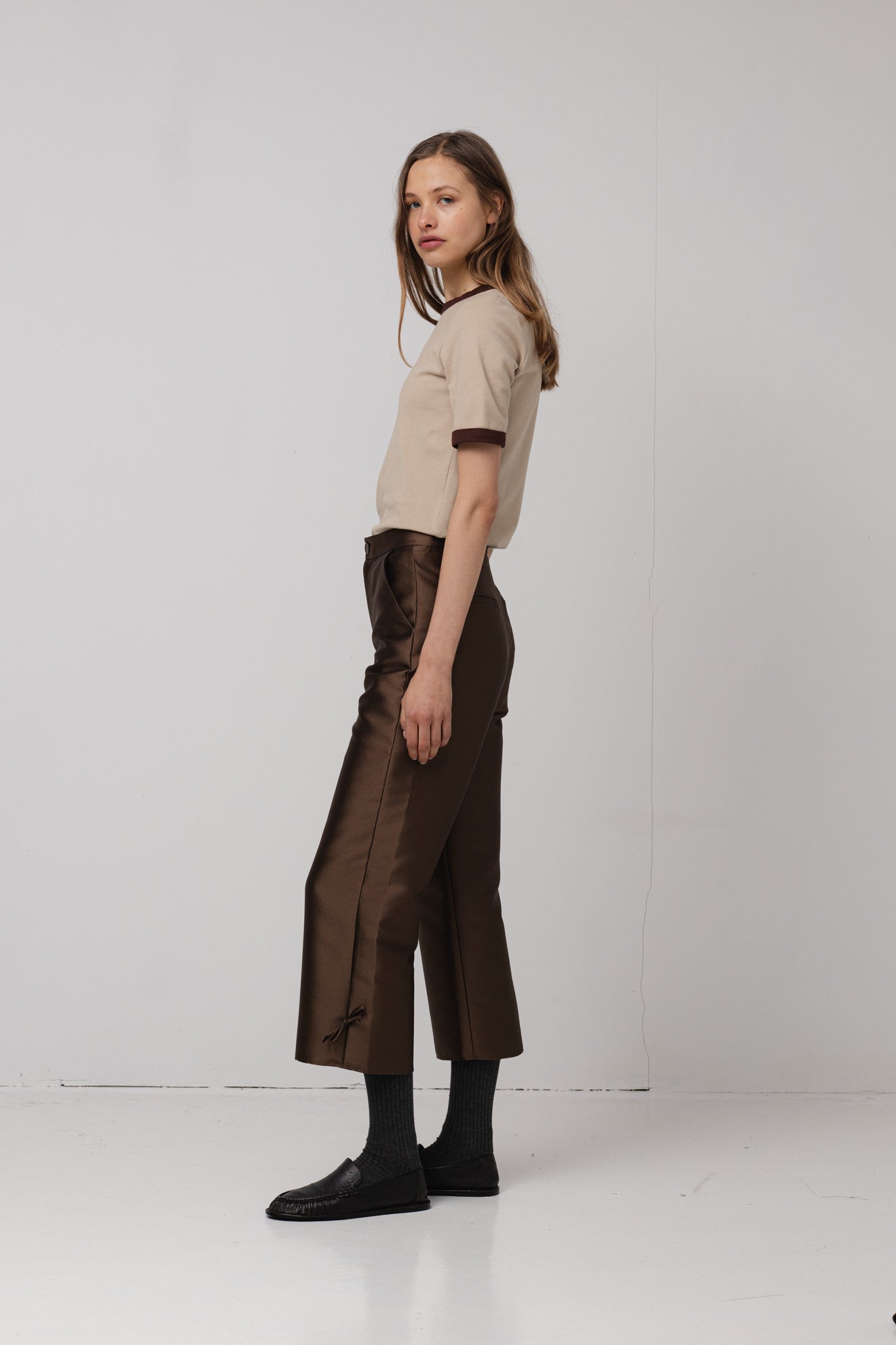 Sweet cropped straight-fit classic pants with a classic waistband. Made from a slightly stiff, shiny fabric and finished with charming bow details at the trouser hems.