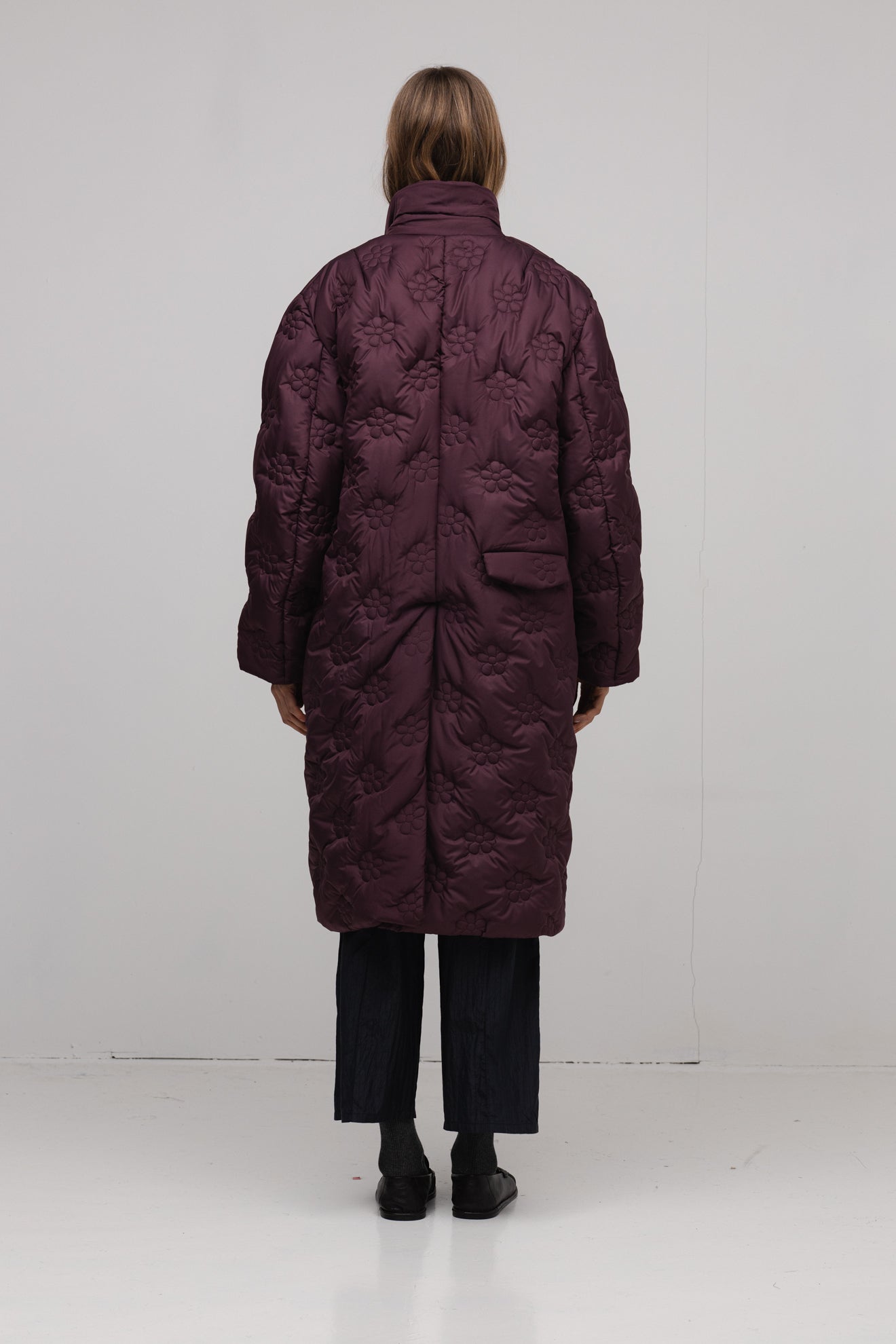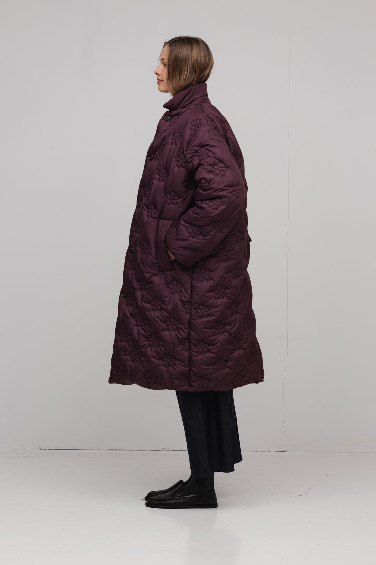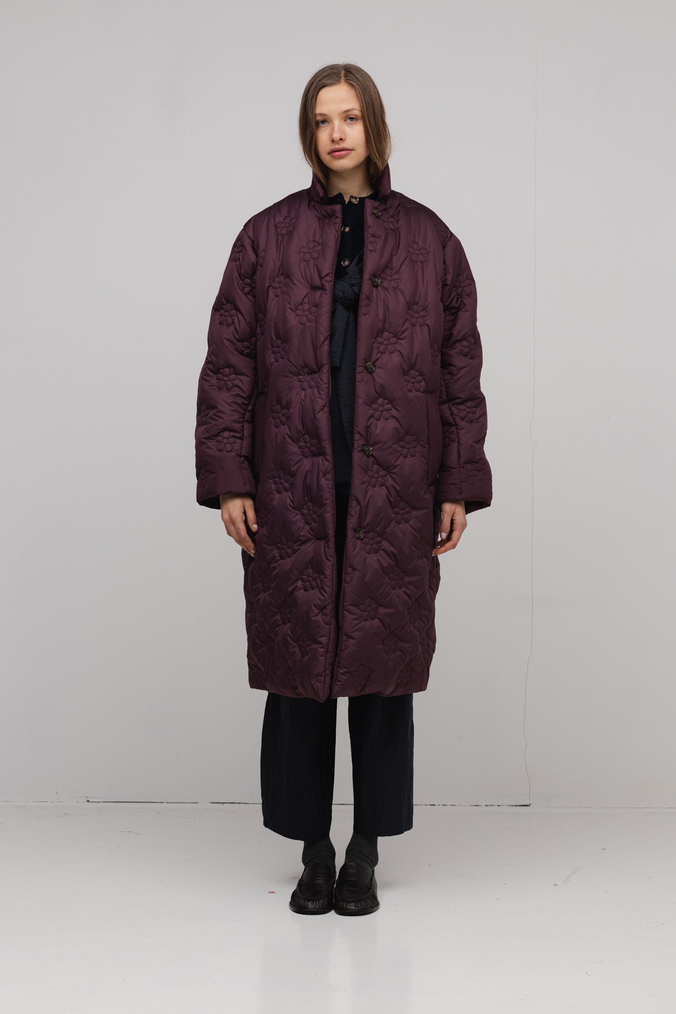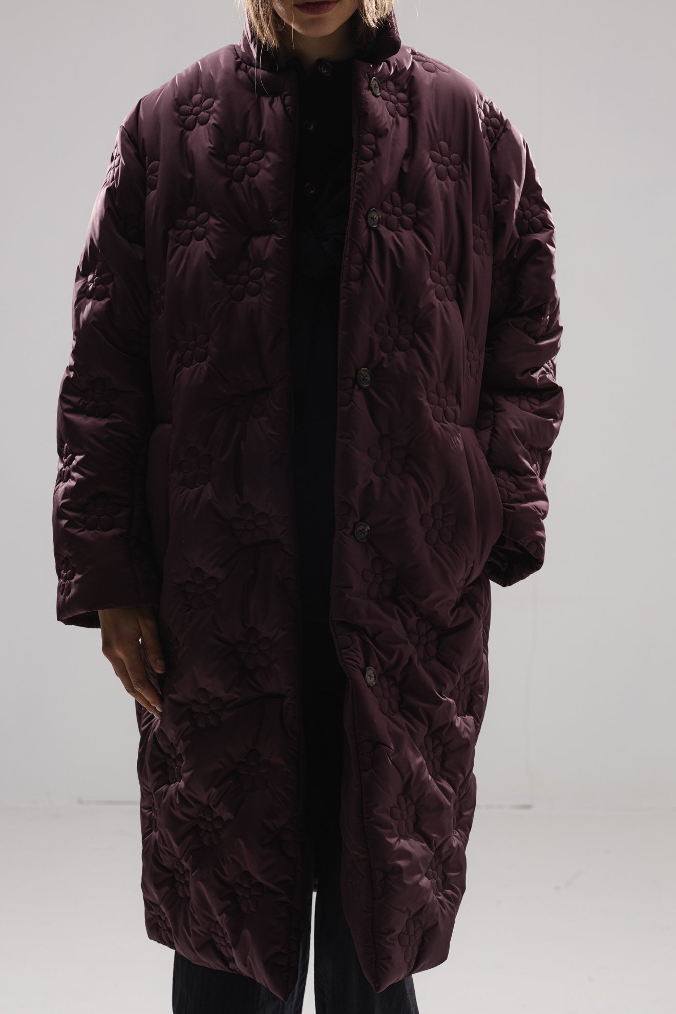 This puff coat is lightly padded and decorated with embroidered flowers all over. It has a boxy, voluminous fit, comes with a classic collar, button front, dropped shoulders, and practical side seam pockets.