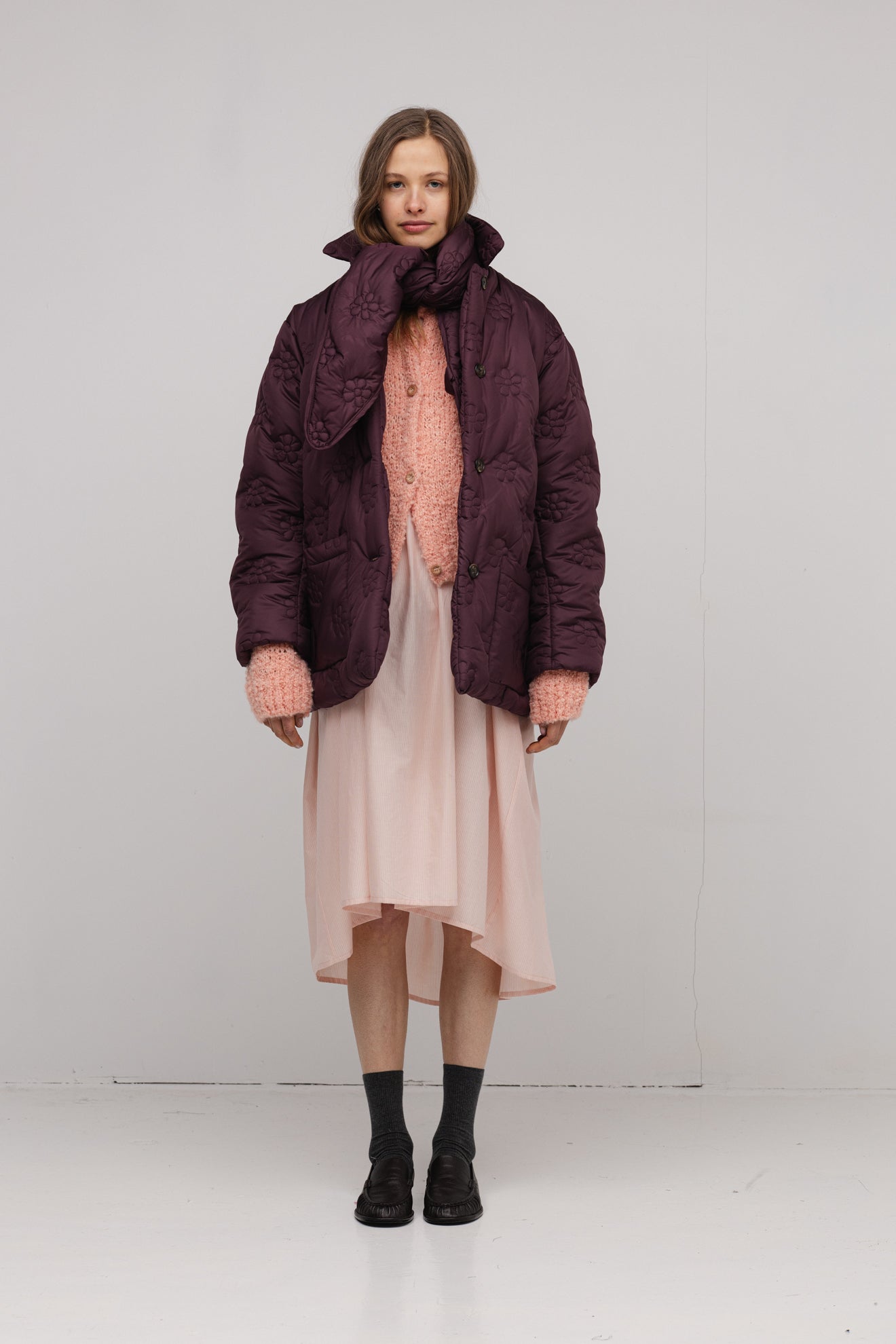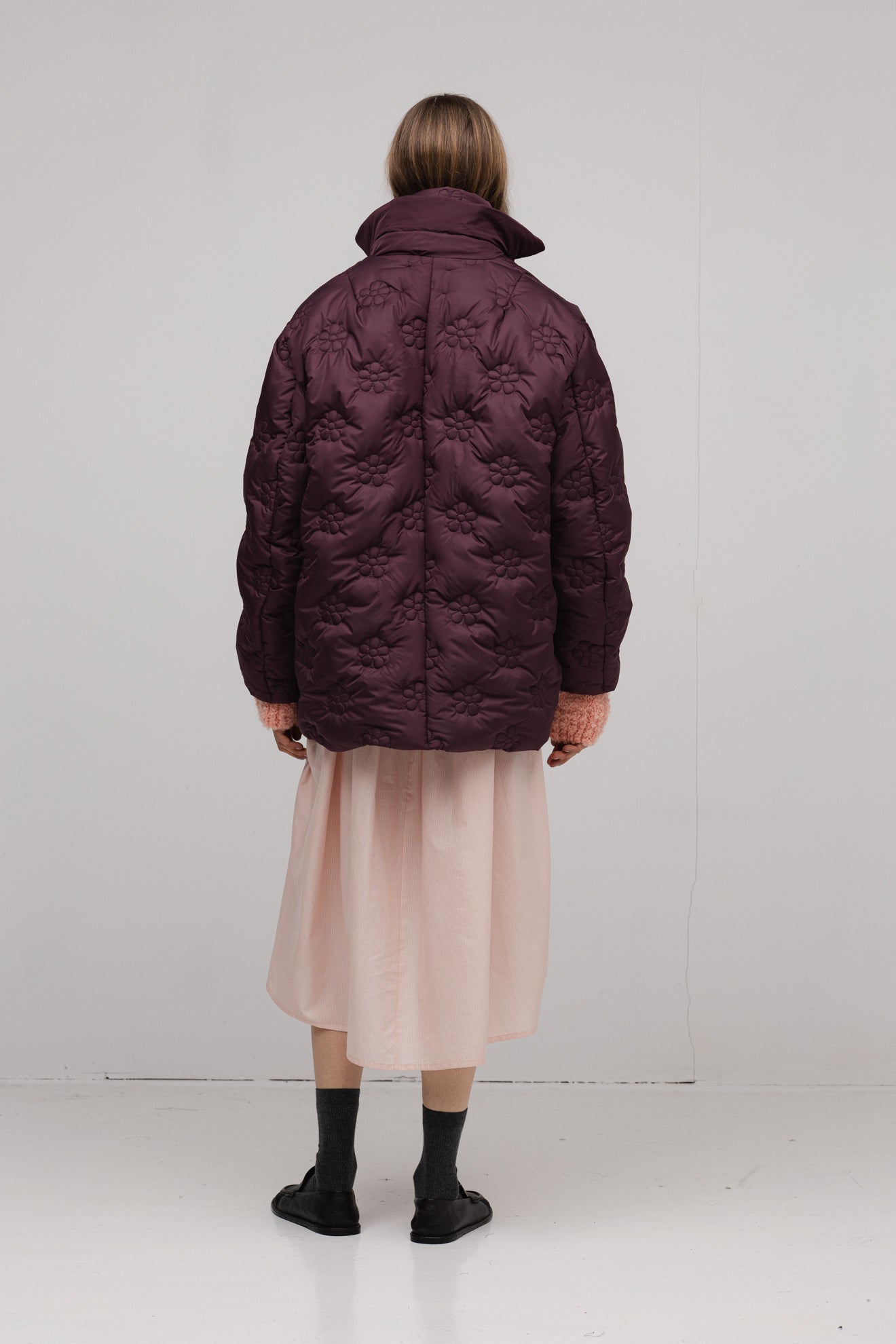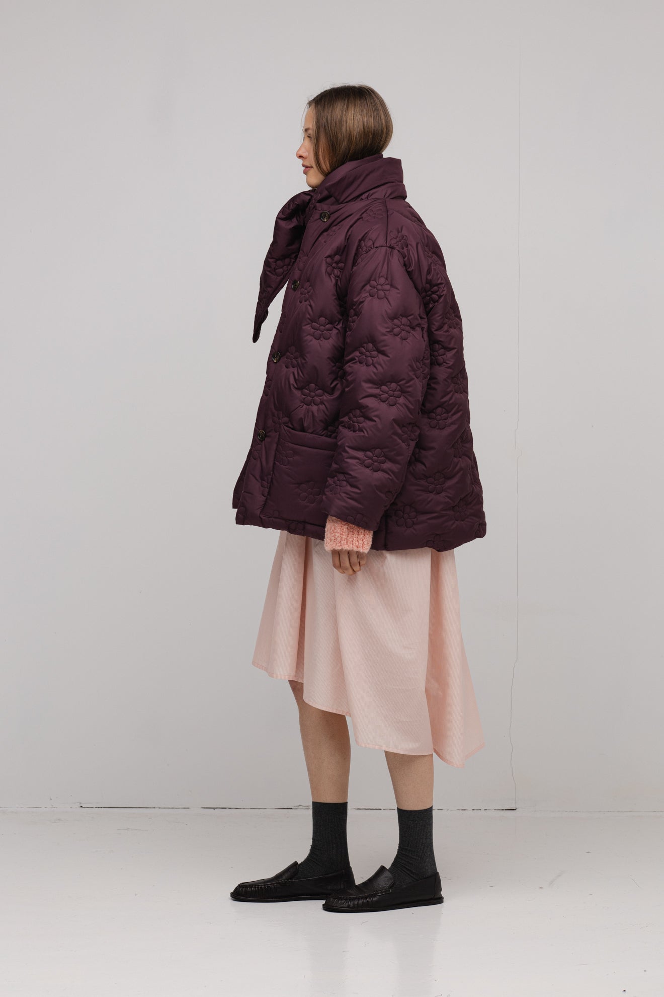 This cropped puff coat is lightly padded and decorated with embroidered flowers all over. It has a boxy, voluminous fit that sits just above the hips, with a classic collar, button front, dropped shoulders, and practical patch pockets at the front.