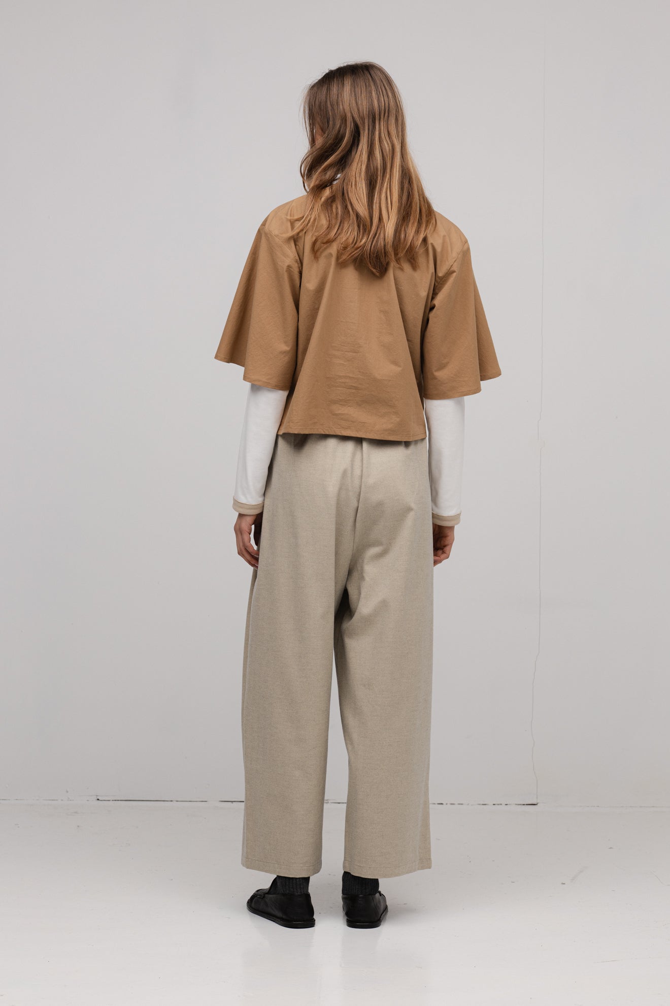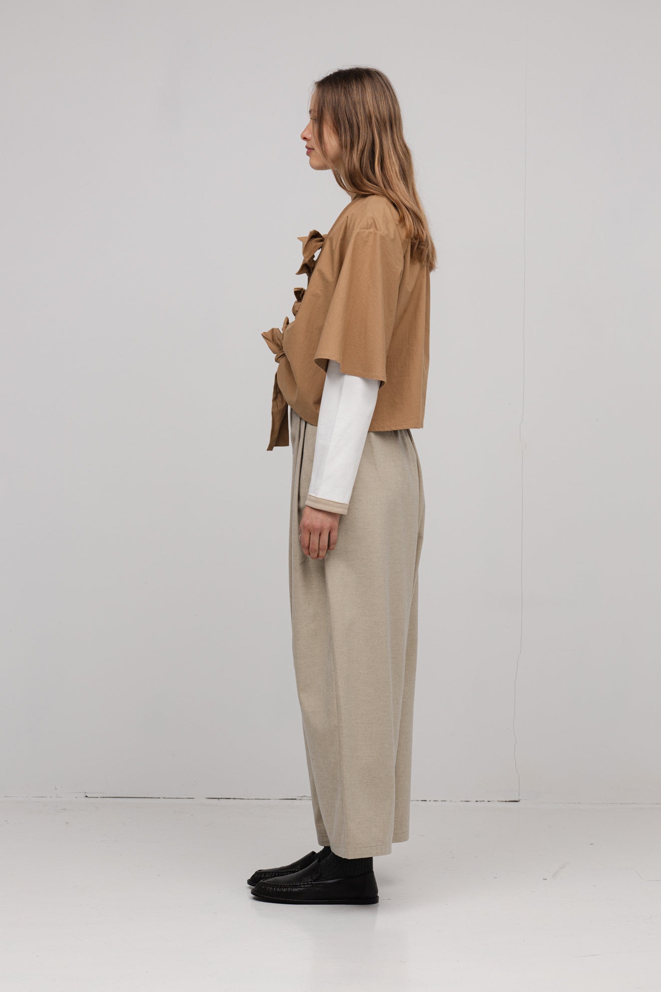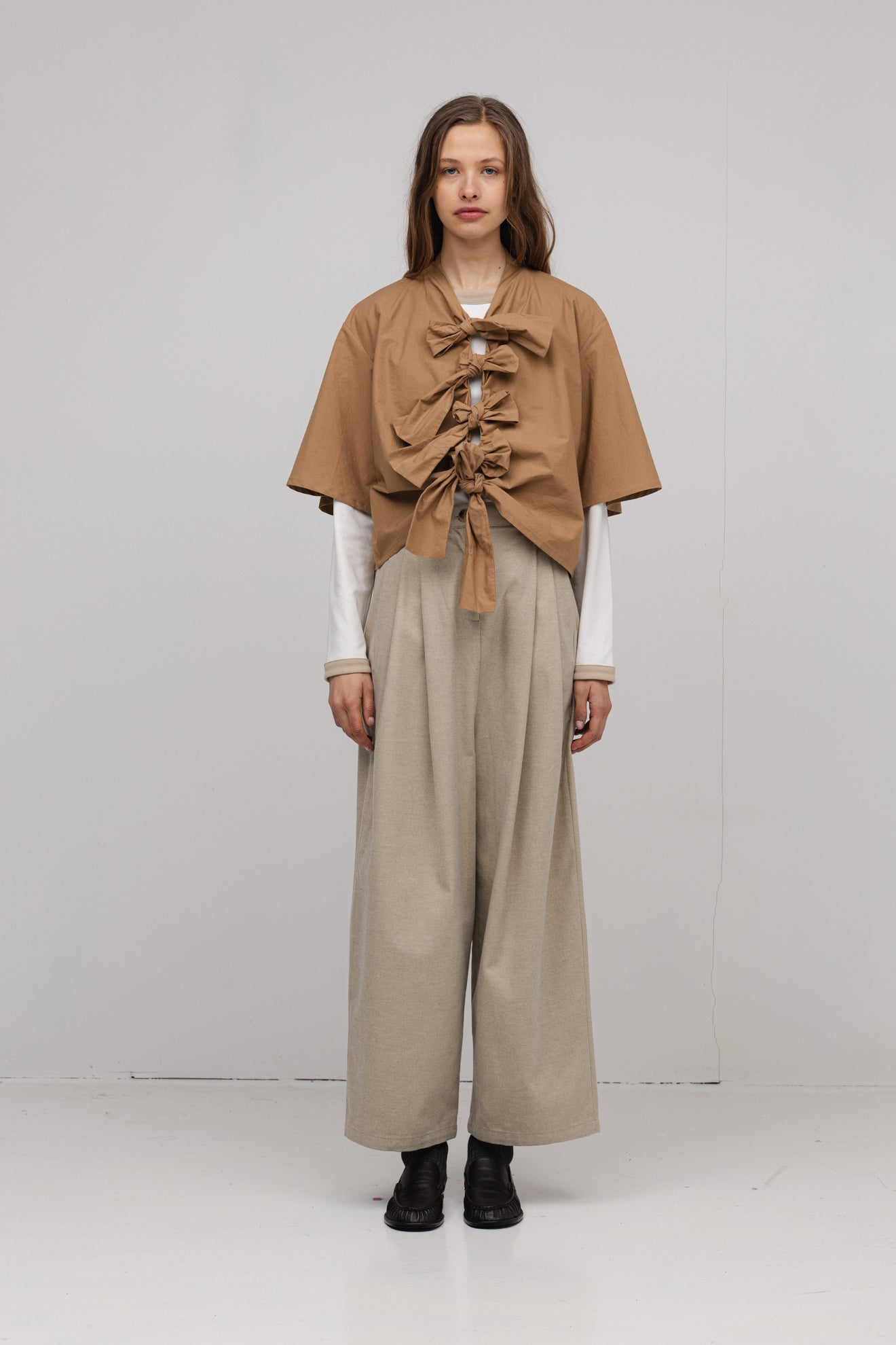 Sweet cotton cropped top with wide short sleeves and a refined front closure that ties into a bow.