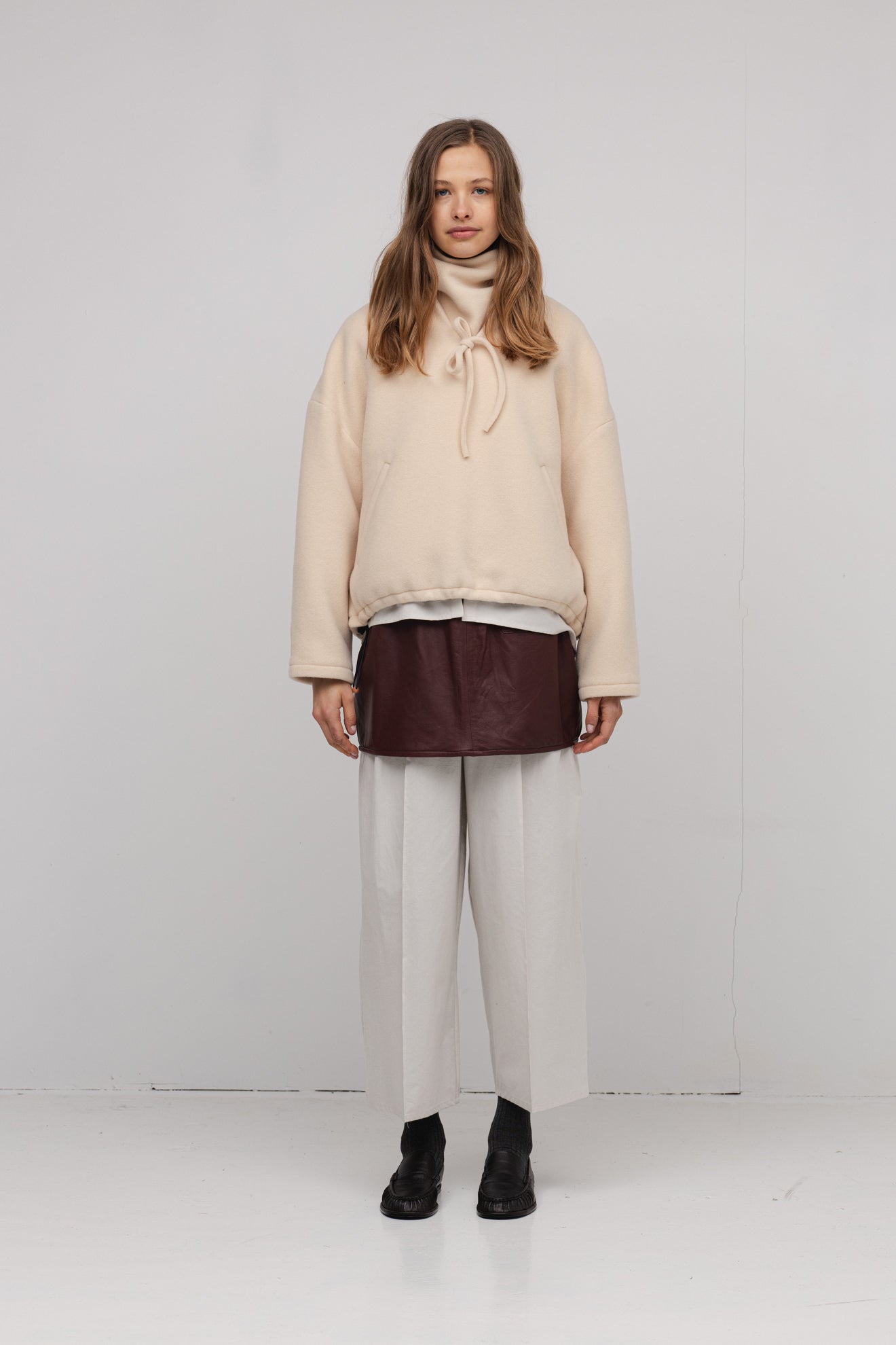 Soft anorak crafted from wool in a cream shade. Lined with fine cotton in a classic check pattern for extra comfort and style. Featuring a practical kangaroo pocket at the front and a sweet bow detail. The elastic hem allows the anorak to be adjusted and styled just the way you like.