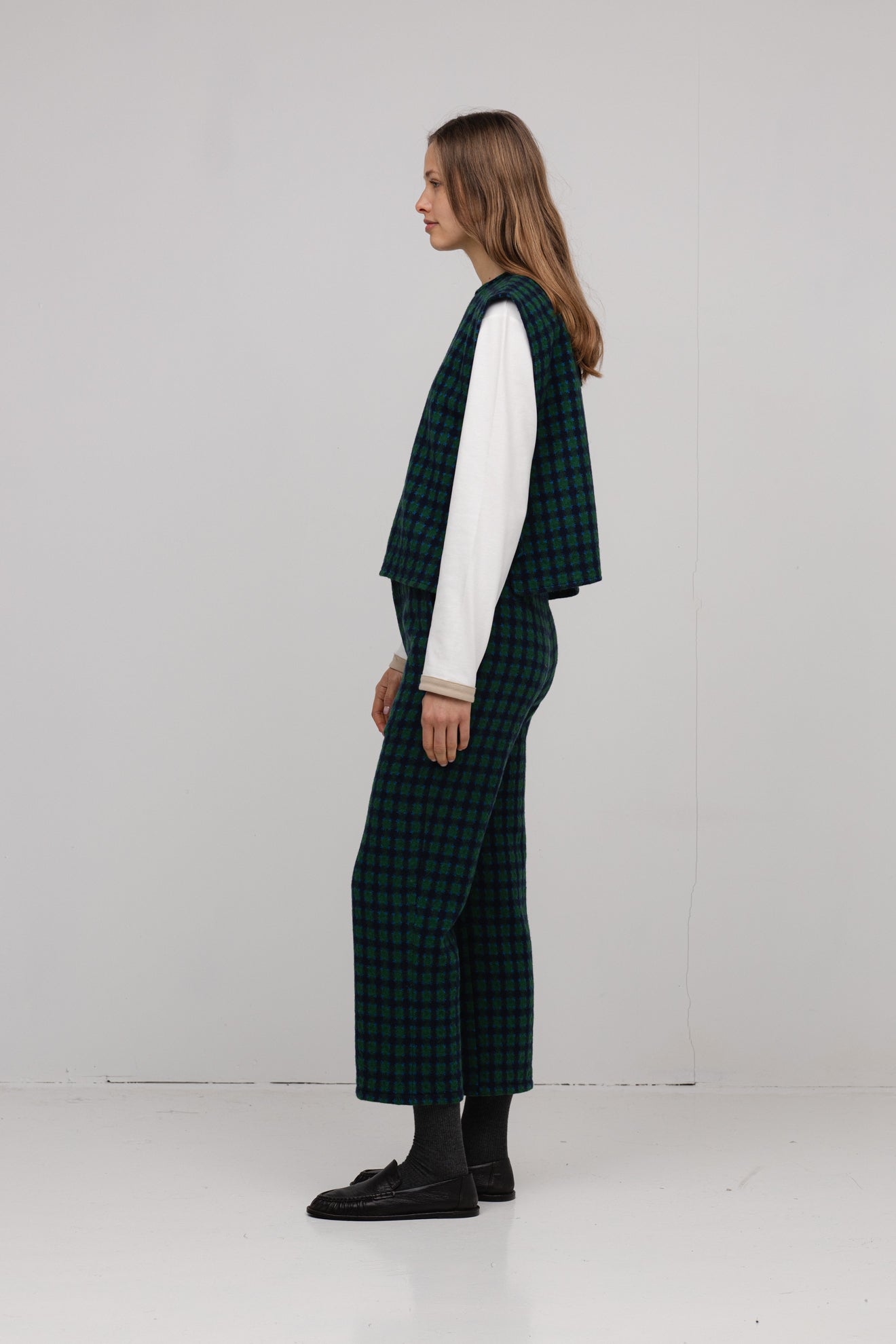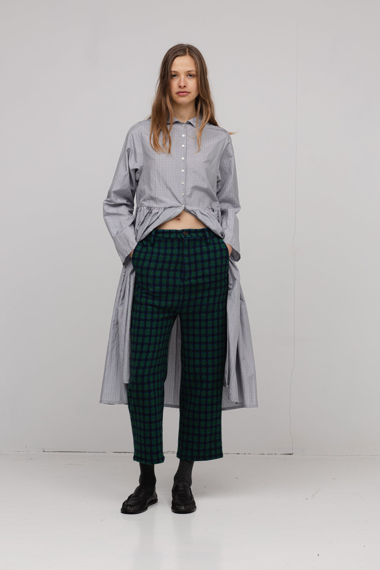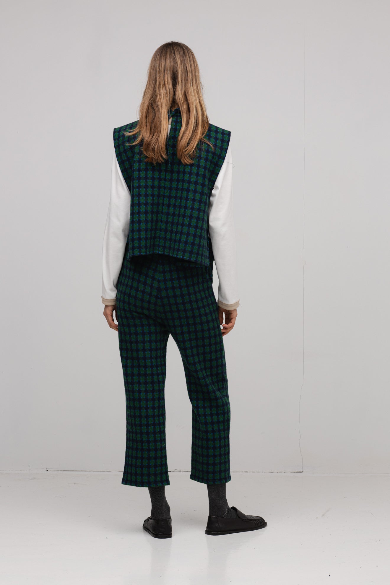 These cropped wool trousers feature a navy check pattern and a relaxed, straight fit. They have an elastic waistband and a welt pocket at the back. Zipper, button closure, and side pockets at the front. Comfortable and stylish for everyday wear.