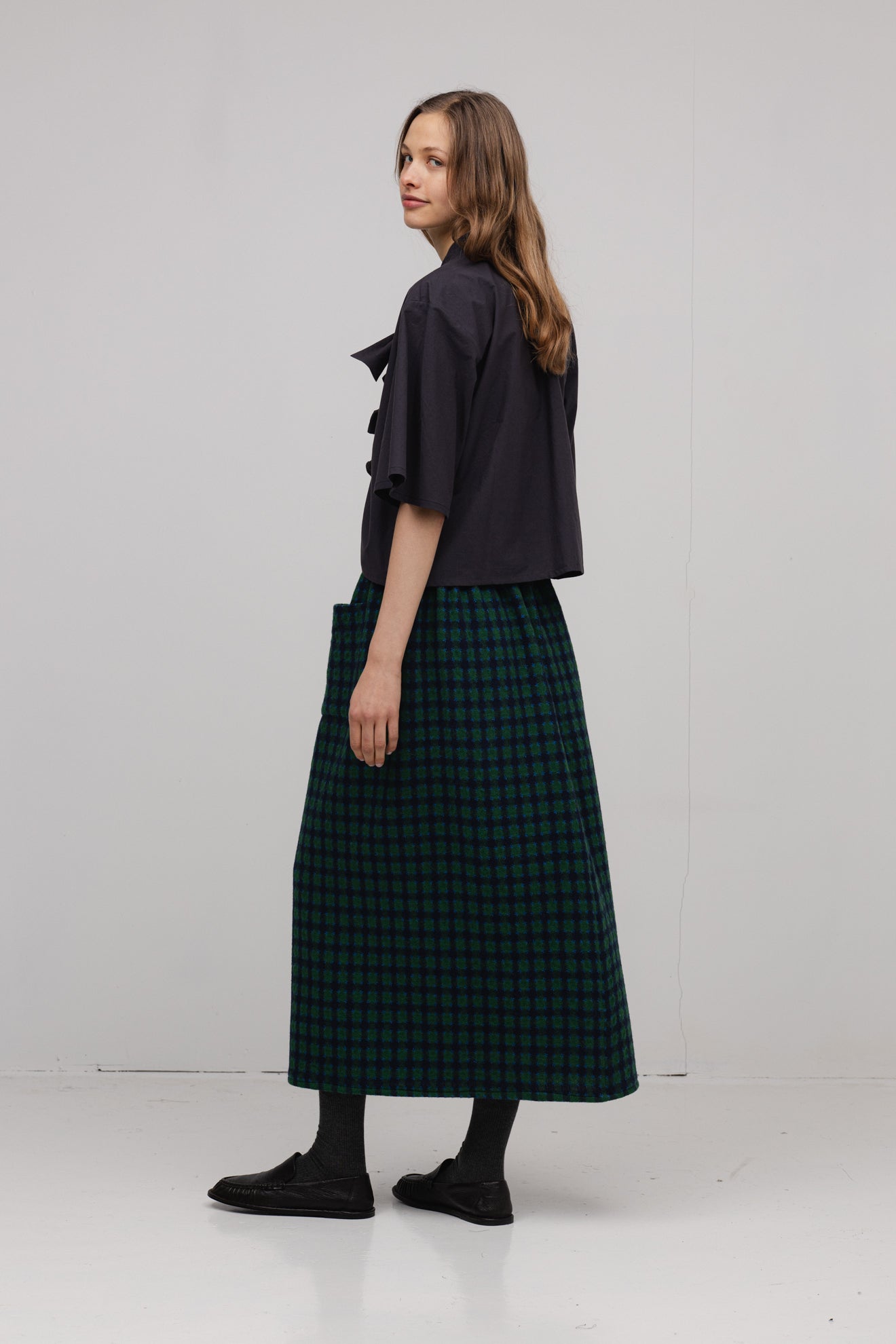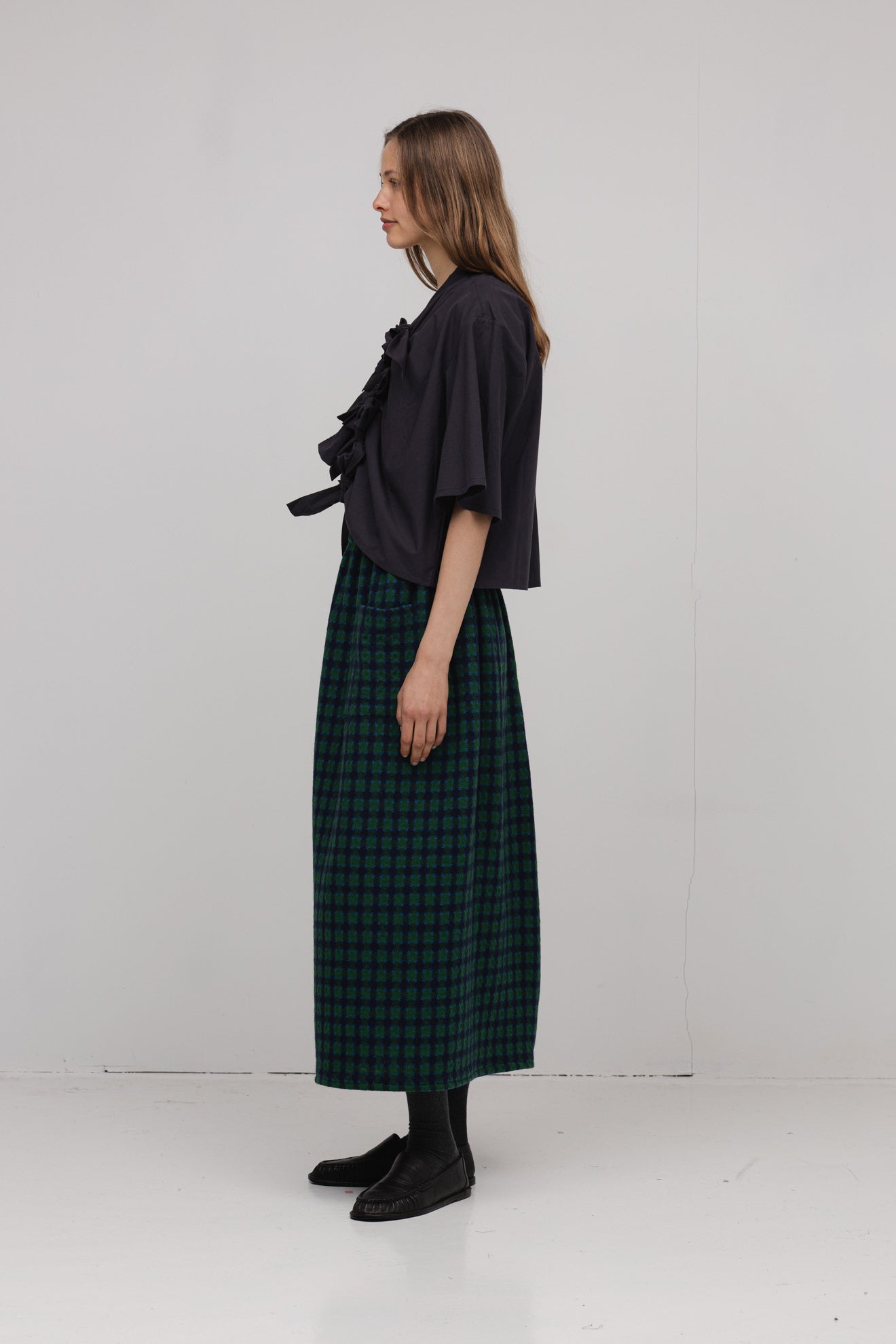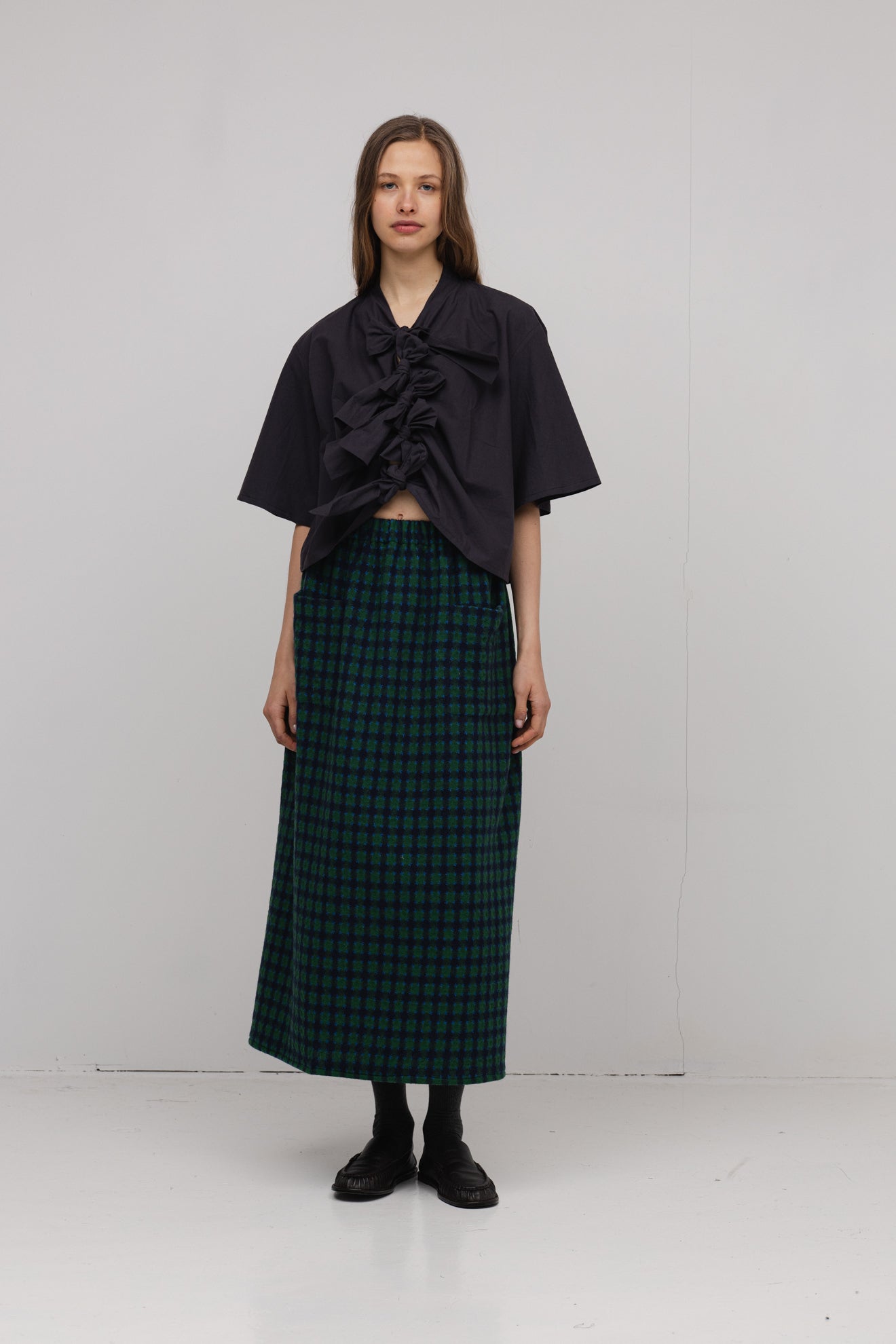 Sweet cotton cropped top with wide short sleeves and a refined front closure that ties into a bow.