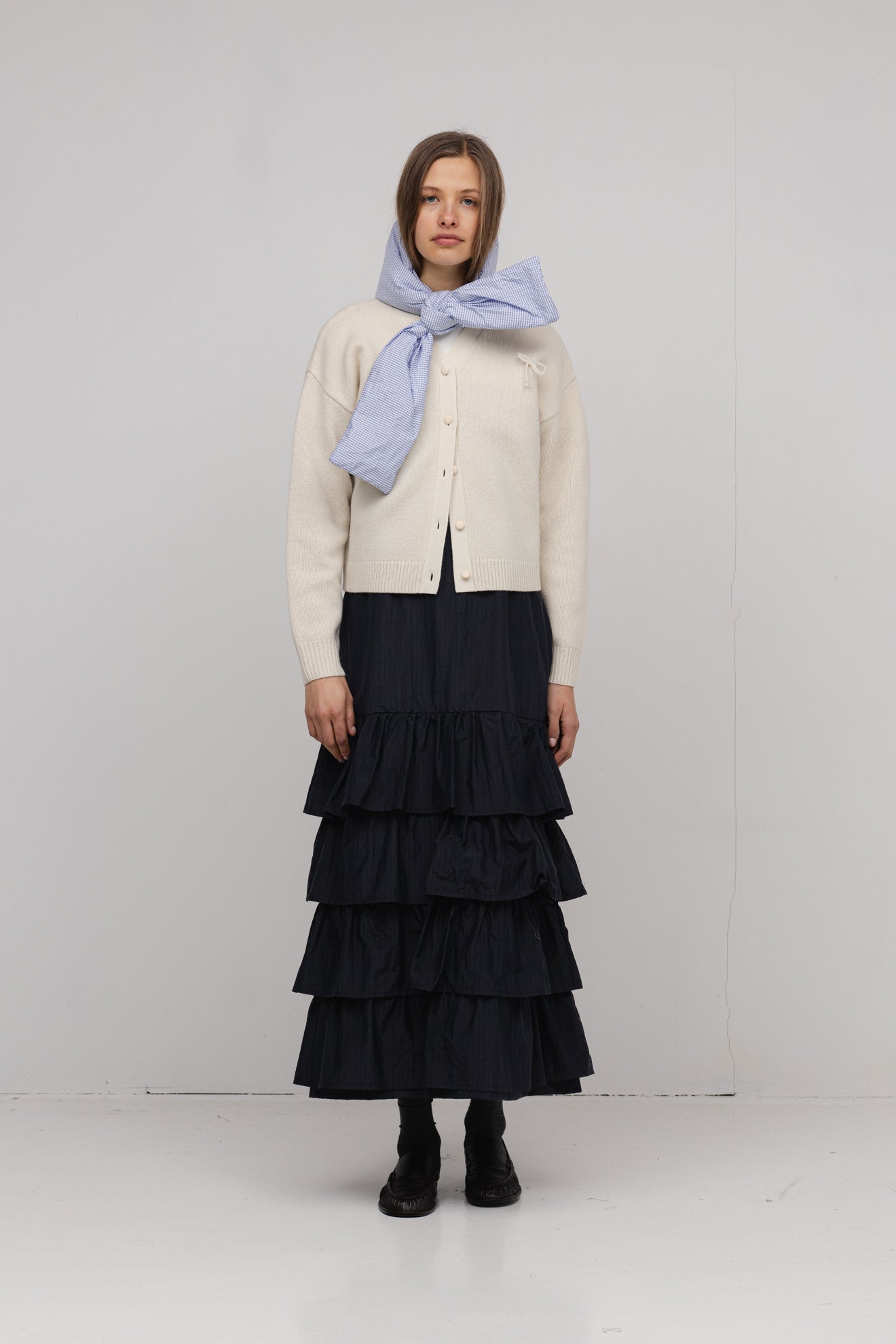 This delightful cashmere cardigan made from 100% soft lambswool, it feels cozy and soft against the skin. With a relaxed boxy fit, a V-neckline, and button-front closure, it’s finished with a sweet bow detail at the front for a playful touch.