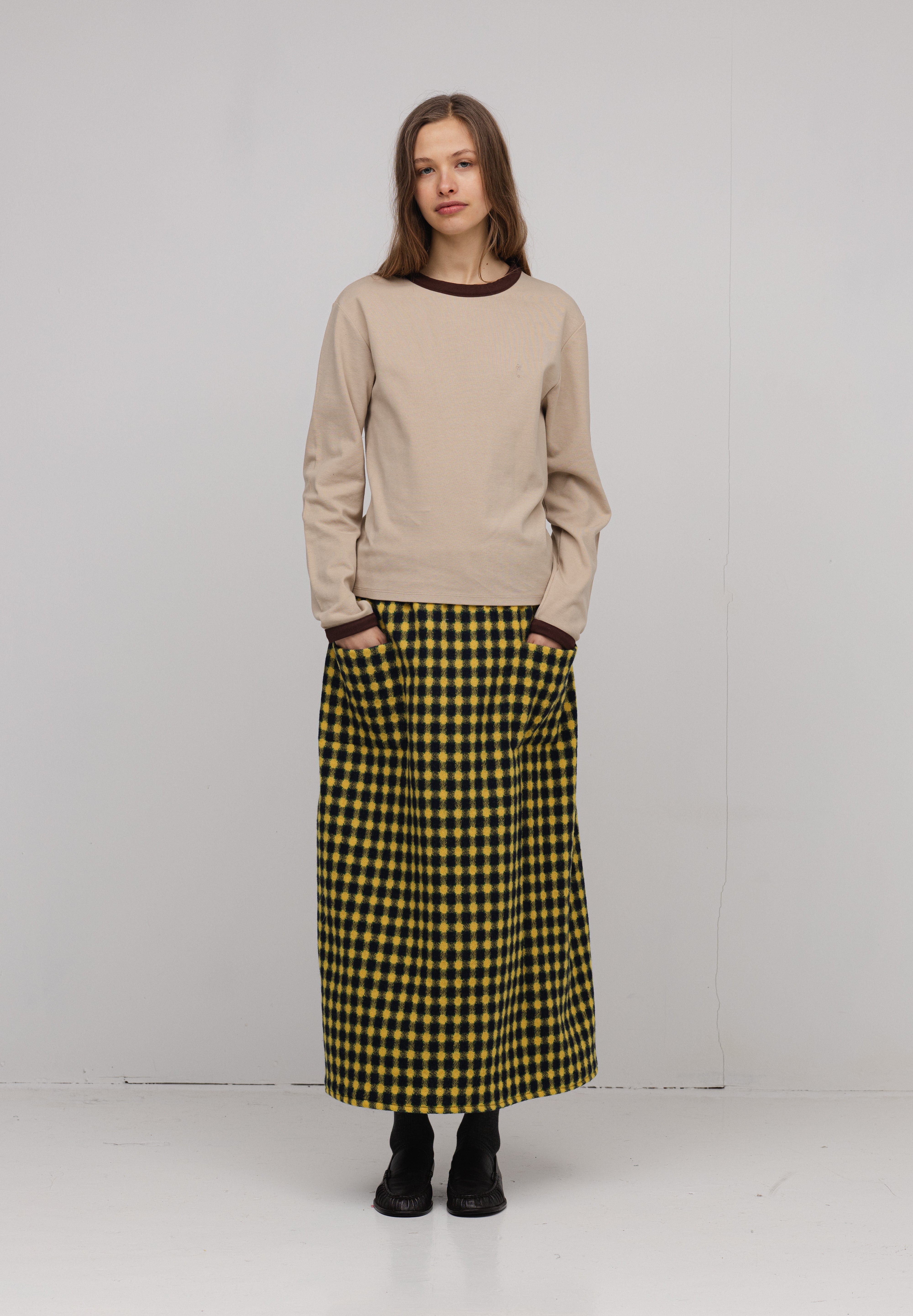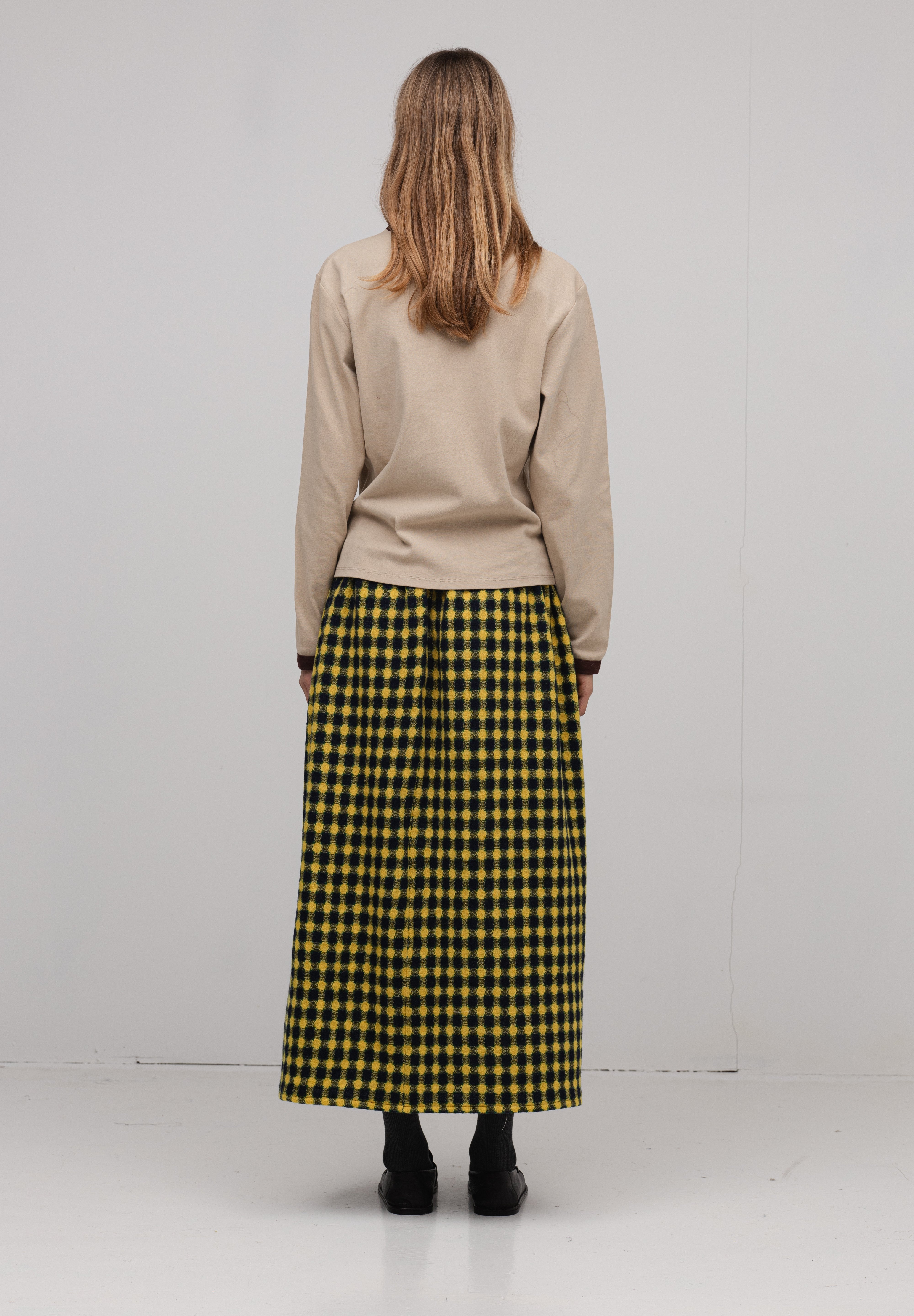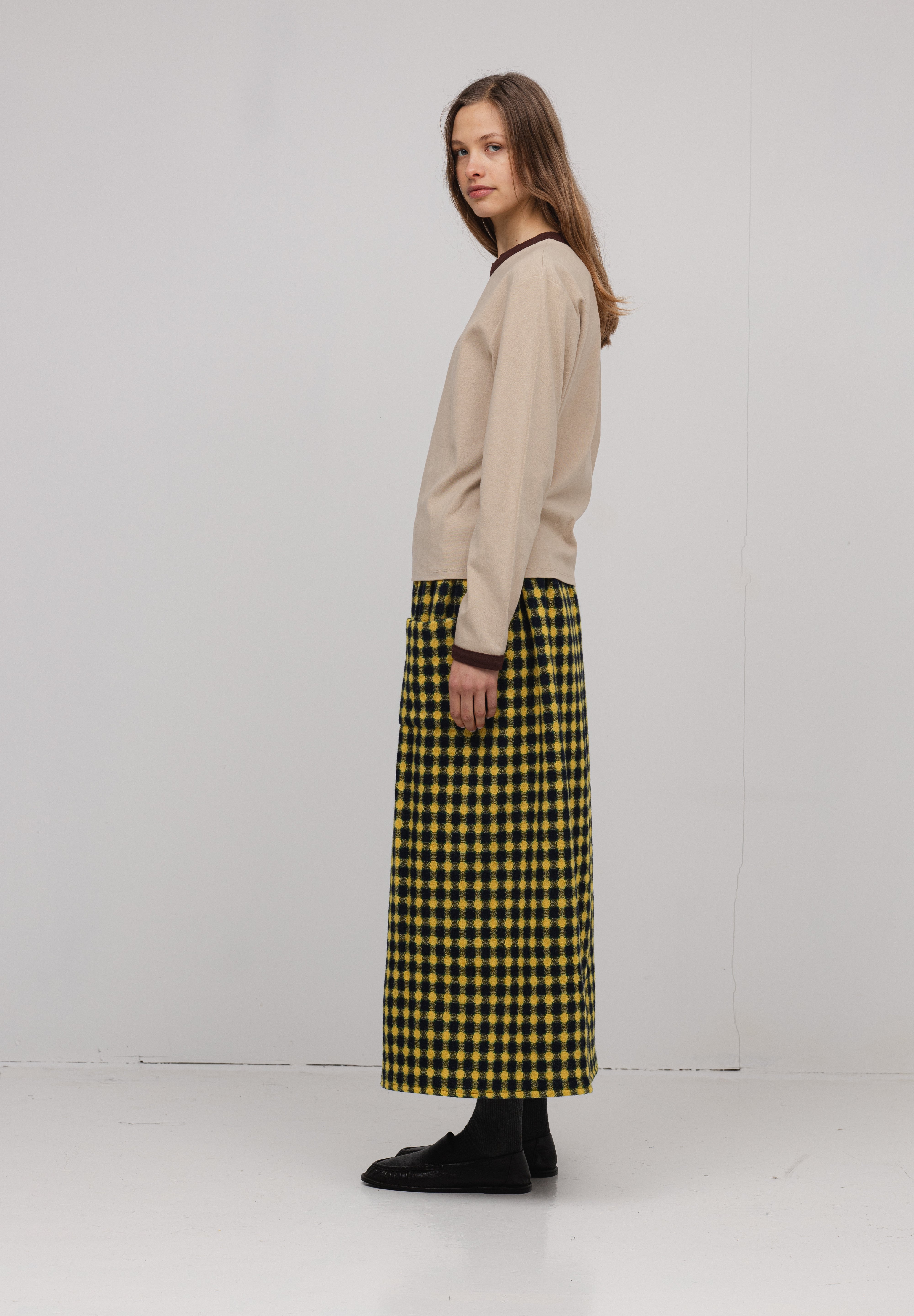 Straight wool skirt in a checked pattern with a small patch pocket at the front and a classic waistband finish.
